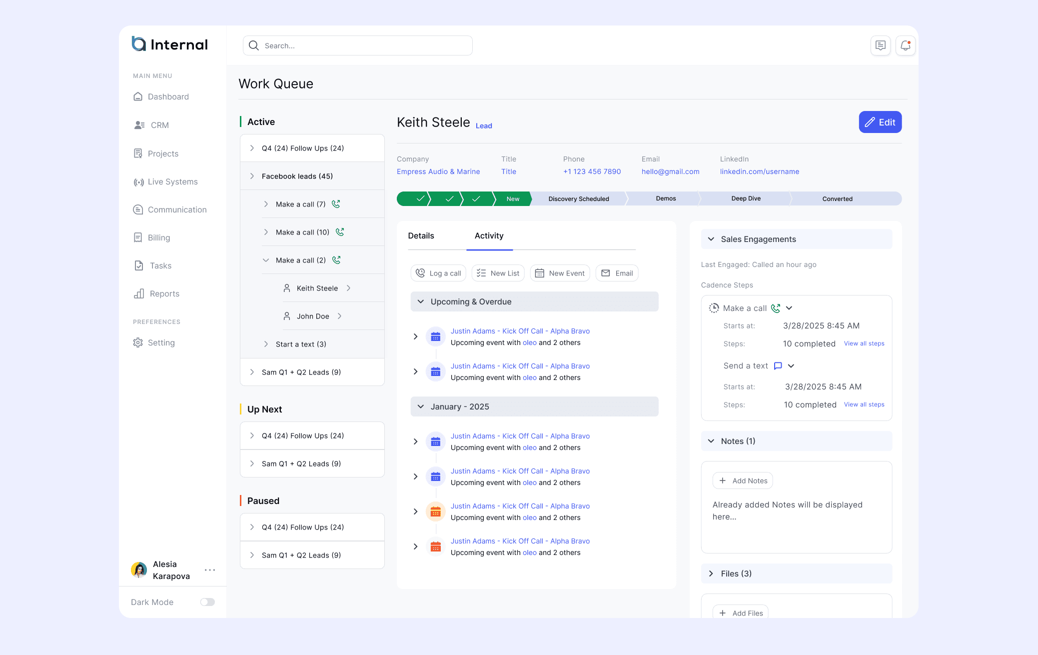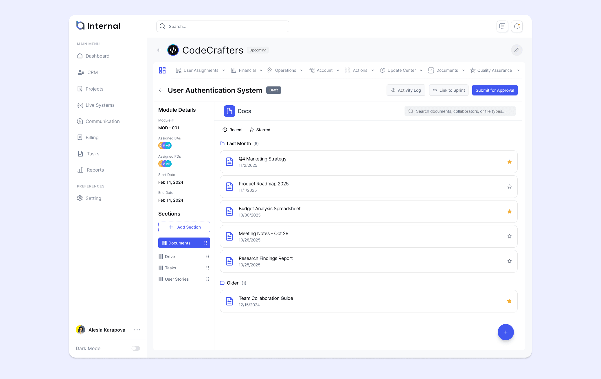 Alpha Core is an internal CRM and operational system that unifies project management, sales, and team workflows. It combines a content management system (CMS), sales flow, sprint management, role-based dashboards, and client tracking into a single, cohesive platform. Designed for internal teams, it streamlines work across departments while keeping everything accessible and organized.